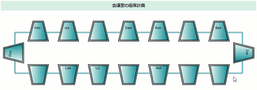 shape.isTextBox(true);本使用例では、会議を開催するために会議室の座席計画を検討します。会議には重要な方のグループが参加することになっているため、座席配置は前もって計画されています。各席はオートシェイプで表現され、メンバーの名前はシェイプのテキストを使用して記載されます。変更があった場合は、名前の追加、編集、または削除も可能です。
