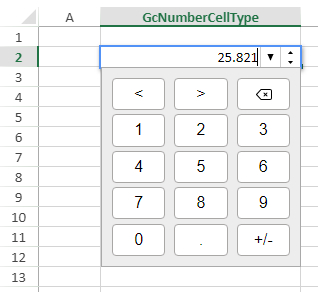 sheet.getCell(1, 1).cellType(gcMaskCellType);GcNumberCellType は、セル内に有効な数値を入力させたい場合に使用します。有効な入力値として、数値および小数値(特定の書式でサポートされる場合)が許容されます。また、無効な値は無視されます。このセル型では、ドロップダウンのテンキーを使用して値を入力することも、スピン機能によって数値を調整することもできます。次の図を参照してください。